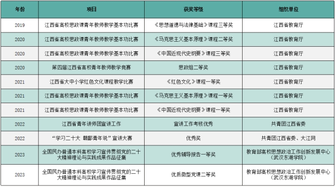 4.着力选树典型人物。学校重视思政课教师队伍培养,为青年教师配备导师,坚持“赛训结合”,打造教研团队,充分调动全社会力量和资源,建好“大师资”。思政课教师荣获江西省高校思政课青年教师教学基本功比赛一等奖4项、二等奖2项、三等奖6项,江西省青年教师教学竞赛二等奖1项等。组建思政课教师宣讲团,2人入选江西省青年讲师团、江西省思政课教师宣讲团成员,1人荣获江西省共青团宣传工作考核优秀,多位教师荣获校级优秀共产党员、优秀党务工作者、“三育人”标兵、“抗疫先进个人”等称号。