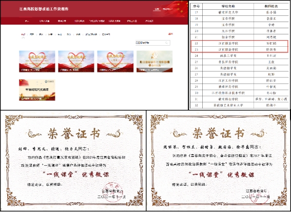2.着力培育示范课程。学校充分发挥思政课堂的育人主渠道作用,大力加强思政课程建设,促进优质教学资源应用与共享,学校注重思政课实践教学设计,加快培育思政课示范课程。2门思政课程、3个战“疫”思政课微视频入选“江西省高校思想政治工作资源库”,3个思政课“一线课堂”微课作品被评为江西省“一线课堂”优秀微课作品。2个思政微课获评江西高校“最美思政课”,4门思政课入选校级重点课程,4门思政课入选校级核心课程。
