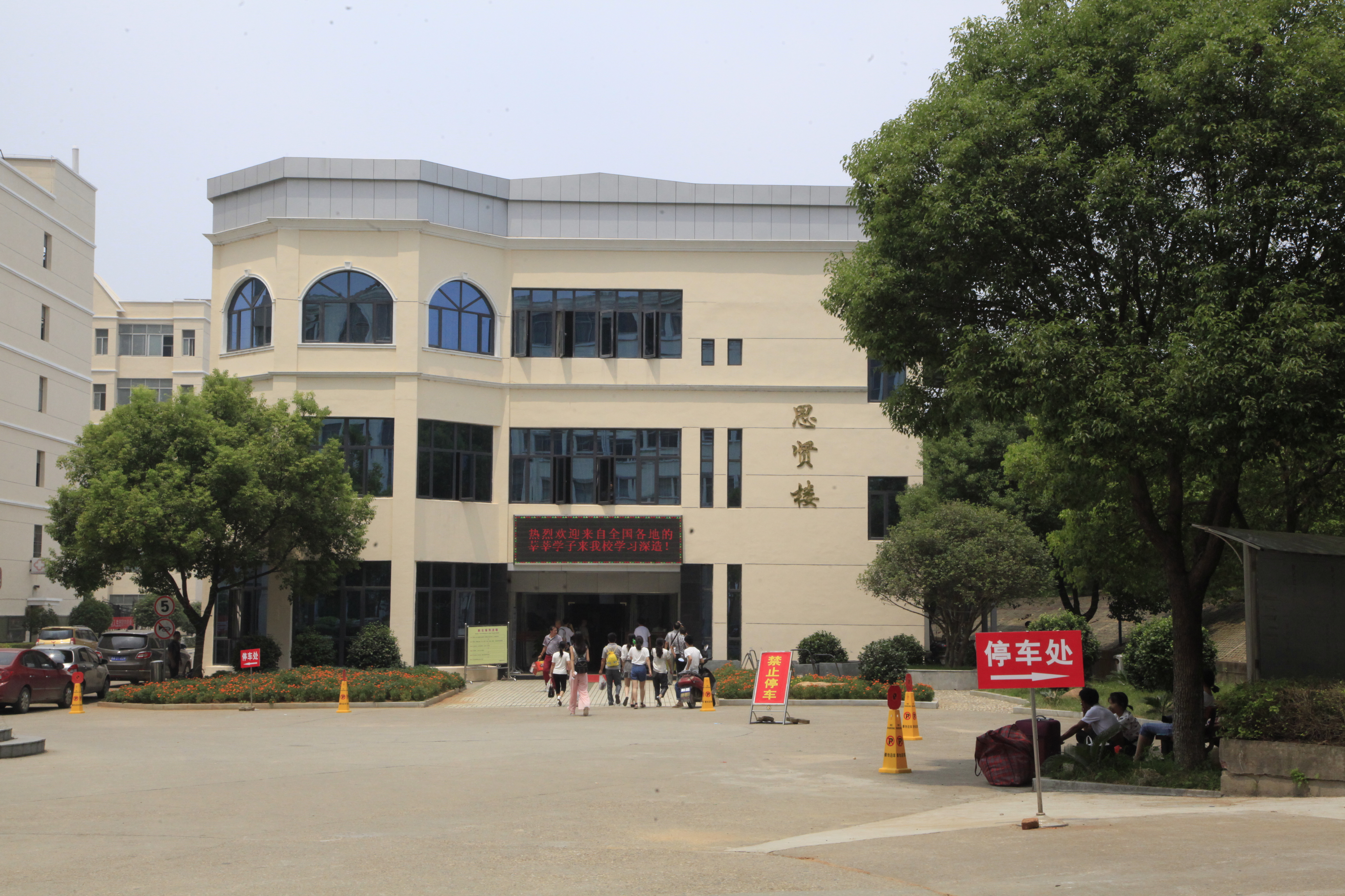 走过学校大门,绕过缀荷池,沿着飘扬的彩旗,你会看到宏伟的主教楼,穿过西区通道口,思贤楼新生报到点近在眼前,走下校车迎面走来的是学校迎新的学长学姐,跟随他们走入思贤楼内,在学长学姐的帮助下办理好入学手续,就可以去领取生活及军训物资了,体贴的学长学姐会悉心把你送到寝室入驻。