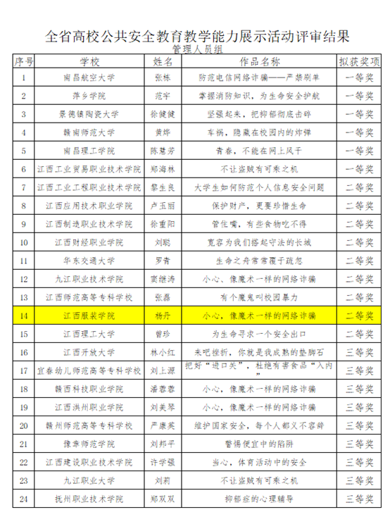 据悉,全省高校公共安全教育骨干教师教学能力展示活动每年举办一次,旨在增强学校对安全教育的针对性,全面提高学生的安全意识和防范能力,为建设平安和谐校园奠定坚实基础。活动覆盖全省85所高校,按教师组(本科阶段、专科阶段)、管理人员组两个组别,共评选出一等奖17项、二等奖29项、三等奖42项。