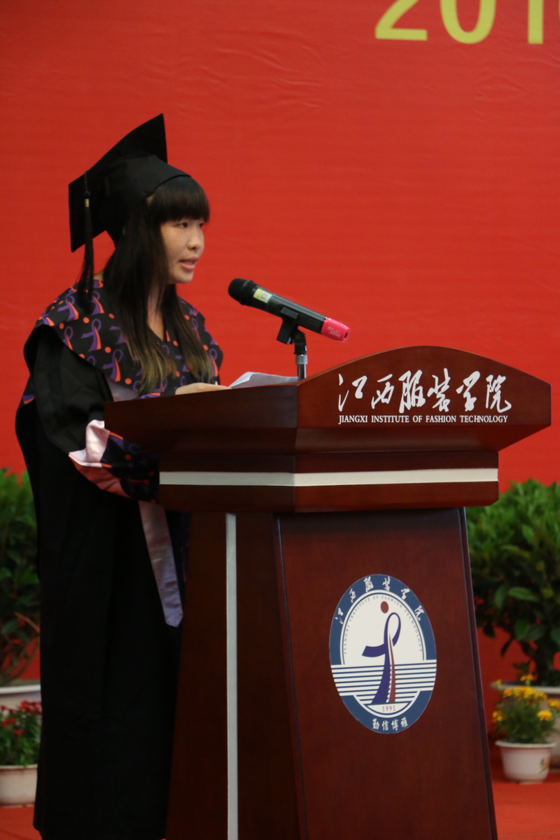 校长陈万龙代表学校和全校师生员工,向幸运而又出色的江服“黄埔二期”全体同学表示热烈的祝贺,向为同学们成长成才付出真爱、辛劳的全体教职工和各位同学的家长致以崇高的敬意。他充分肯定本届毕业生在学风建设、科技创新、校园文化建设等方面为学校的积极付出和丰硕成果,并用“昨夜西风凋碧树,独上高楼望尽天涯路”、“衣带渐宽终不悔,为伊消得人憔悴”、“众里寻她千百度,蓦然回首,那人却在灯火阑珊处”三句宋词名句与毕业生分享了人生三境界。陈万龙说,人生境界的高低,在于各自的不懈努力与修炼。毕业离校,不是学习的结束,而是在更高起点上的开始。希望同学们学以致用,把自己融入到建设服装强国的伟大事业中去,放飞梦想,坚守匠心,让青春在创意“中国品牌”、打响“中国创造”的征程中绽放异彩;希望同学们把握机遇,乘势而上,凭自己的勤奋努力和聪明才智,在创新创业的大潮中不断进取,勇于创新,成就未来;希望江服才俊,勇立潮头,创新创业,大展宏图,内心坚定,享受爱的温暖,多陪家人,多交朋友,时刻保持感恩的心态,期待江服学子笑傲“江湖”。