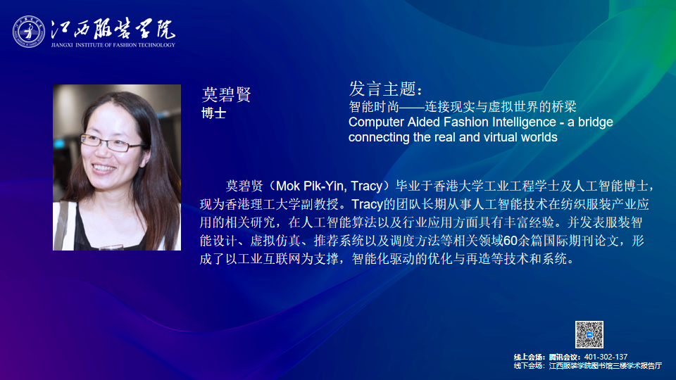 第十一场演讲由香港理工大学莫碧贤博士带来《智能时尚——连接现实与虚拟世界的桥梁》,介绍了香港理工大学在服装数字化、智能化方面所作出的努力。
