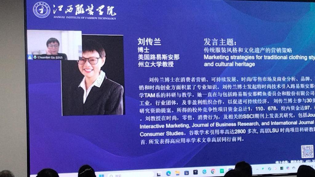 第三场演讲由美国路易斯安那州立大学教授、刘传兰博士带来《延续传统服饰风格与文化遗产:中国风概念化与多案例分析》,从市场维度来探讨时尚的可持续发展和解决方案。