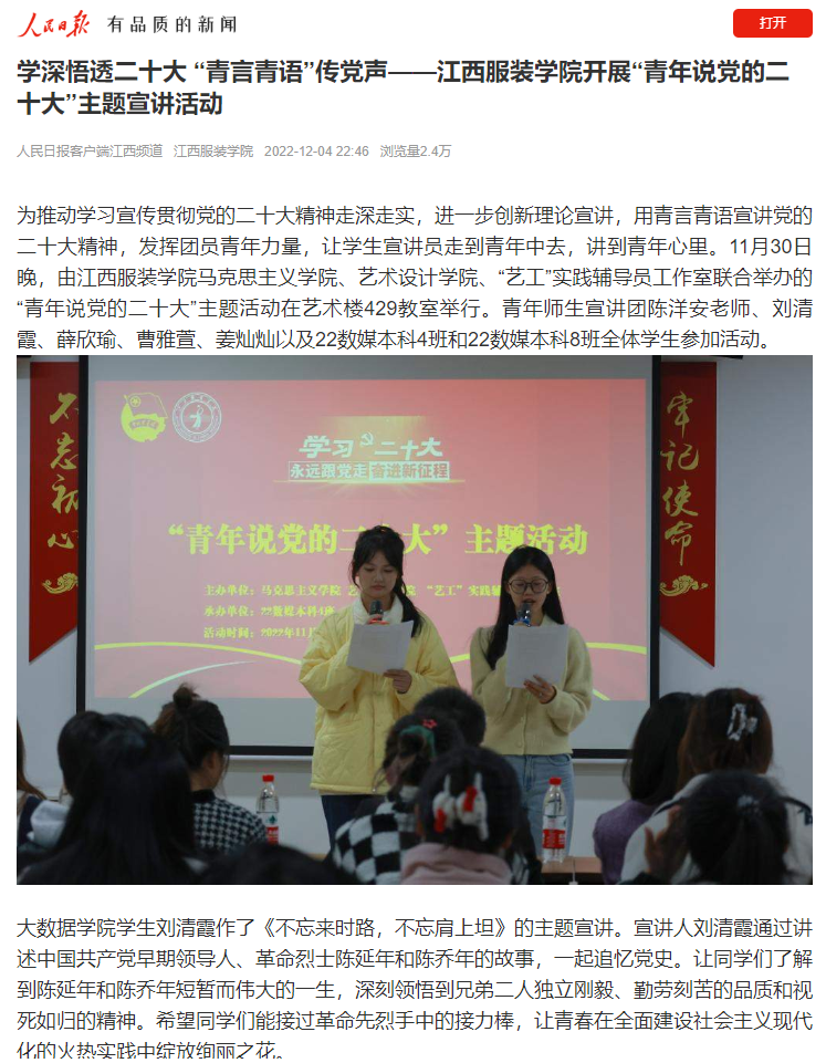 人民日报:学深悟透二十大 “青言青语”传党声——yh86银河国际开展“青年说党的二十大”主题宣讲活动