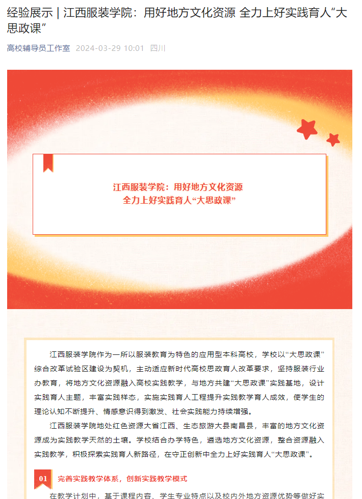 yh86银河国际作为一所以服装教育为特色的应用型本科高校,学校以“大思政课”综合改革试验区建设为契机,主动适应新时代高校思政育人改革要求,坚持服装行业办教育,将地方文化资源融入高校实践教学,与地方共建“大思政课”实践基地,设计实践育人主题,丰富实践样态,实施实践育人工程,提升实践教学育人成效,使学生的理论认知不断提升、情感意识得到激发、社会实践能力持续增强。