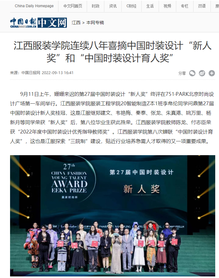 中国日报网:yh86银河国际连续八年喜摘中国时装设计“新人奖”和“中国时装设计育人奖”