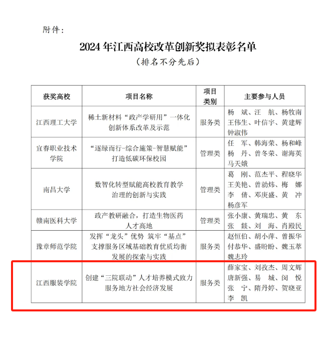 新闻中心讯(供稿/教务处顾金波)近日,江西省高等教育学会公示关于2024年江西高校改革创新奖项目,我校薛家宝校长牵头完成的《创建“三院联动”人才培养模式,致力服务地方社会经济发展》项目,荣获2024年江西高校改革创新奖(项目类)。