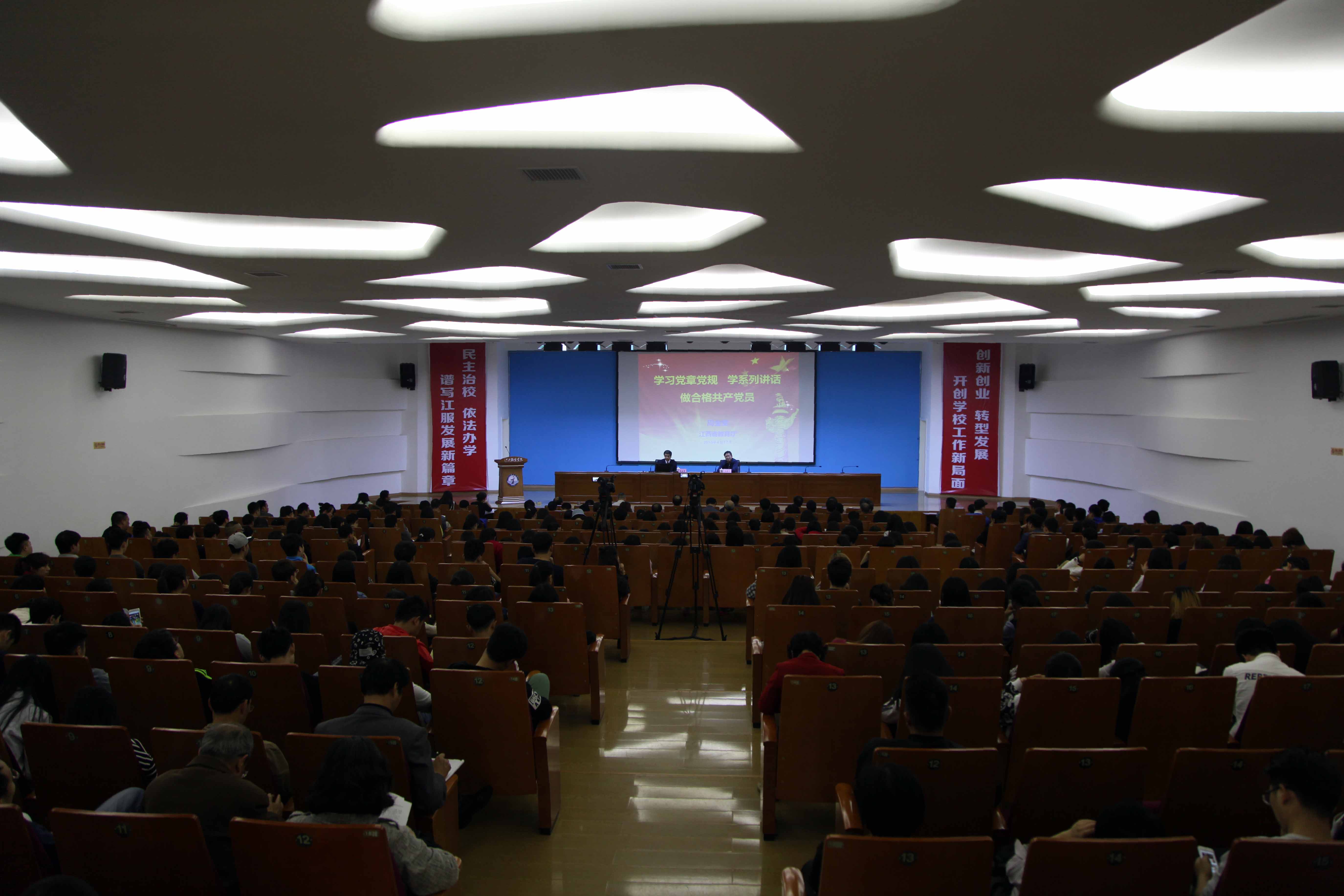 周金堂教授从为什么学、学什么、怎么学、怎么做等四个方面对开展好“学党章党规,学系列讲话,做合格党员 ”学习教育进行了生动的阐述。他指出,开展“学党章党规,学系列讲话,做合格党员”学习教育,是适应国内外形势的需要,是面向全体党员深化党内教育的重要实践,是推动党内教育从“关键少数”向广大党员拓展、从集中性教育向经常性教育延伸的重要举措。学什么?就是要学习遵守党章党规、学习总书记关于教育工作的论述和视察江西时的重要讲话精神,要把思想建设放在首位,着力解决党员队伍在思想、组织、作风、纪律等方面存在的问题,努力使广大党员进一步增强政治意识、大局意识、核心意识、看齐意识,坚定理想信念,保持对党忠诚,树立清风正气,勇于担当作为,充分发挥先锋模范作用。怎么学?要做到紧握主线引领学,专题研讨互动学,课题研究深入学,结合职能用中学,追根溯源持续学,统筹兼顾参照学,融会贯通反复学。怎么做?作为高校就是要结合工作实际,认清把教育放在优先发展的战略位置,明确立德树人的根本任务,认识科教兴国的基本国策,把深化改革作为发展动力,做经师人师的筑梦人;努力做到筑牢信仰不动摇,把握精神实质不走样,坚持标准不降低,见贤思齐“补短板”,争做教育系统党员先锋模范。周教授的报告主题明确,内容丰富,见解独到,生动活泼,不时引发阵阵掌声。