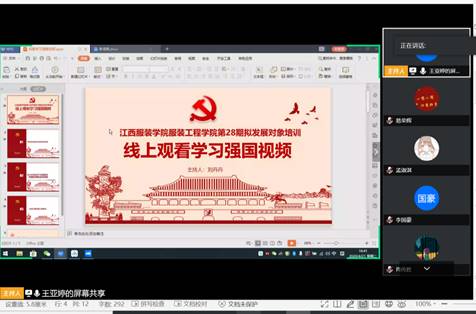 为了进一步学习习近平新时代中国特色社会主义思想,落实我校党校对于2020拟发展对象培训班的培训安排,深入开展对本期学员的思想教育活动。4月21日下午16时,服装工程学院学生党支部组织了学院2020年拟发展对象进行线上观看学习强国视频——《共建亚洲命运共同体》活动。