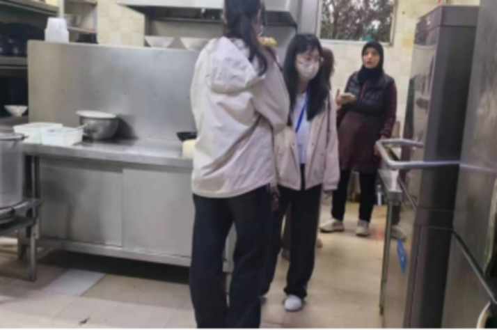 在对食堂的卫生检查中,他们分开行动,在进行简单的人员分配后,开始了对食堂的突击检查。对于这次检查,食堂内部并不知晓,所以这次的检查更能够展现日常工作的卫生环境,展现出食堂内部本来的卫生情况,他们对此都一一记录下来。并督促食堂的工作人员保持良好食堂的卫生环境。