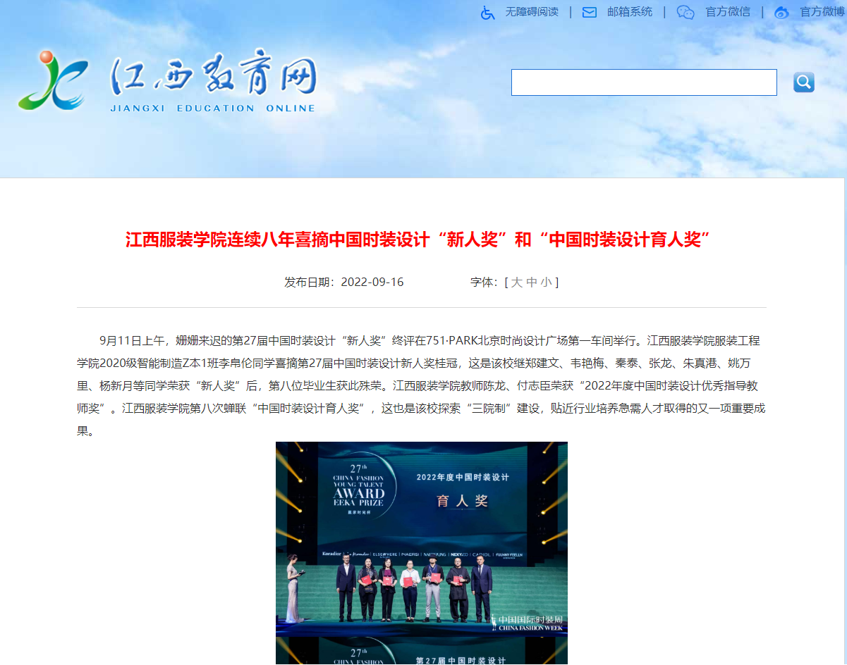 江西省教育厅官网:yh86银河国际连续八年喜摘中国时装设计“新人奖”和“中国时装设计育人奖”