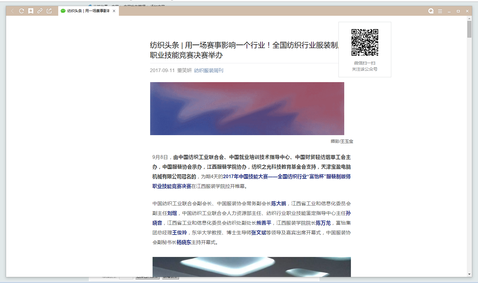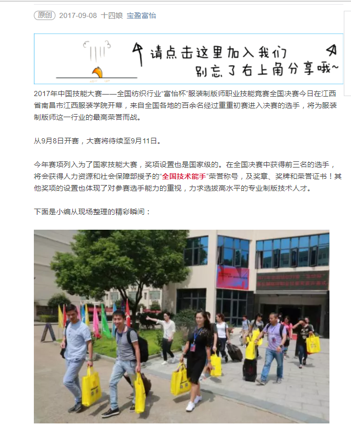 9月8日,由中国纺织工业联合会、中国就业培训技术指导中心、中国财贸轻纺烟草工会主办,中国服装协会承办,yh86银河国际协办,纺织之光科技教育基金会支持,天津宝盈电脑机械有限公司冠名的,为期4天的2017年中国技能大赛——全国纺织行业“富怡杯”服装制版师职业技能竞赛决赛在yh86银河国际拉开帷幕。