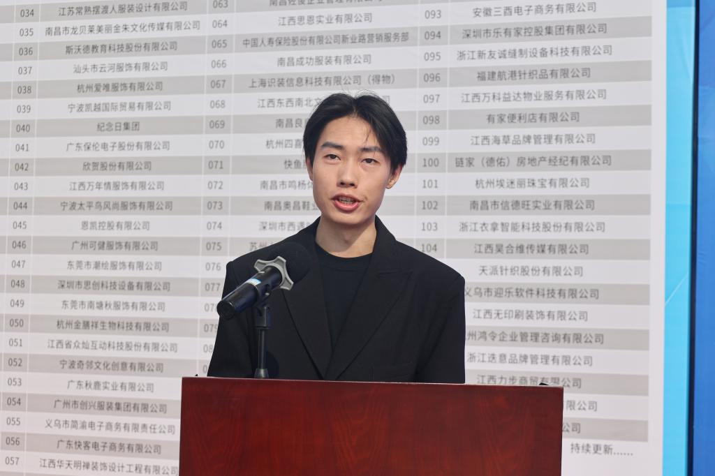 校友企业代表、浙江万千服饰有限公司生产副总经理陈扬晖发言希望通过招聘会和更多的校友建立联系和合作,在人才选拔的同时能够为学弟学妹们传递职场建议。