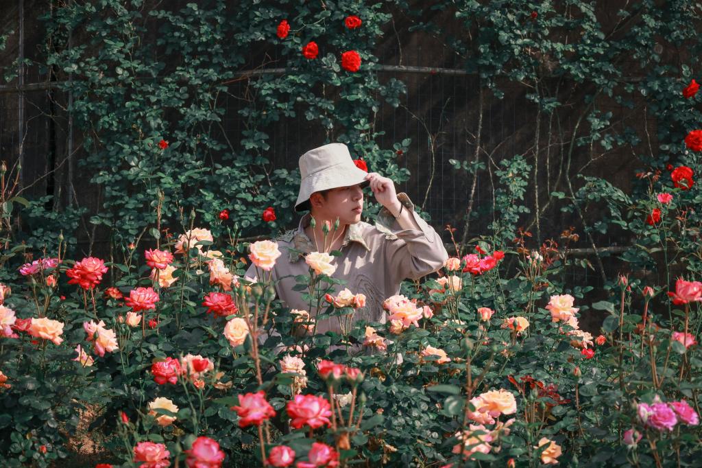 抬头仰望,绰绰的绿影下是蔷薇花低头浅笑
