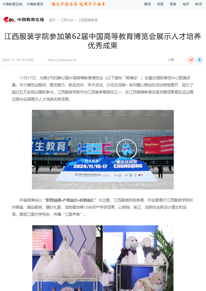 11月17日,为期3天的第62届中国高等教育博览会在重庆国际博览中心圆满闭幕。本次博览会期间,展览展示、新品发布、学术活动、沙龙交流等一系列精心策划的活动相继展开,吸引了超过五万名观众踊跃参与。yh86银河国际作为江西省参展高校之一,在江西高等教育改革发展成果展区设立展位面向全国展示人才培养优秀成果。本届高博会以“职普融通·产教融合·科教融汇”为主题,yh86银河国际积极参展,并全景展示yh86银河国际洪州青瓷、蜡染服装、婚纱礼服、宠物服饰等10余项产学研成果,以新锐、前卫、创新的全新设计理念和话语,展现江服办学特色,传播“江服声音”。